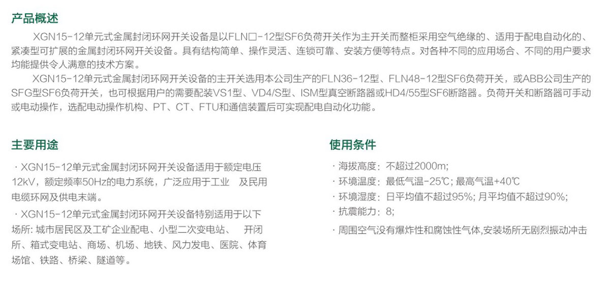 XGN15-12 單元式金屬封閉環(huán)網(wǎng)開(kāi)關(guān)設(shè)備適用于額定電壓 12KV ,額定頻率 SOHZ的電力系統(tǒng),廣泛應(yīng)用于工業(yè)及民用電纜環(huán)網(wǎng)及供電末端。XGN15-12單元式金屬封閉環(huán)網(wǎng)開(kāi)關(guān)設(shè)備特別適用于以下場(chǎng)所:城市居民區(qū)及工礦企業(yè)配電、小型二次變電站、開(kāi)閉所、箱式變電站、商場(chǎng)、機(jī)場(chǎng)、地鐵、風(fēng)力發(fā)電、醫(yī)院、休育場(chǎng)館、鐵路、橋梁、隧道等。